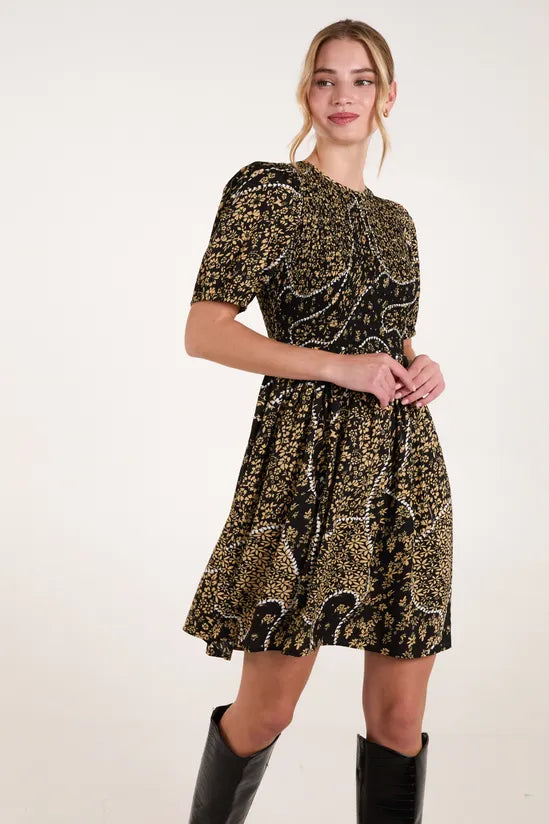 This elasticated shirred waist dress is a quick and easy option to wear to work. Team with tights and chunky boots.